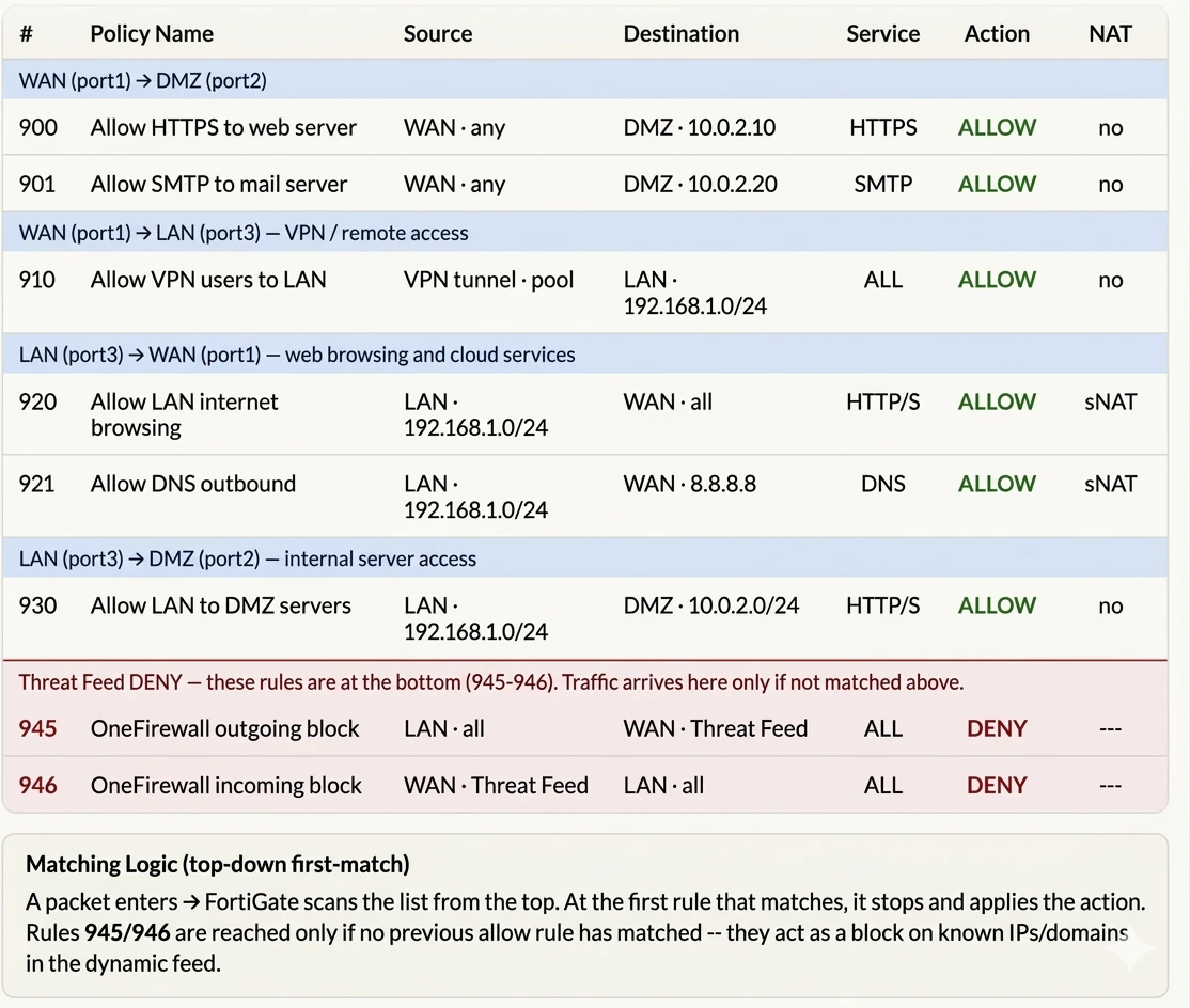 This guide describes how to integrate OneFirewall Alliance (OFA) Threat Feeds into a FortiGate Security Fabric using external dynamic lists (EDLs). The integration enables automatic enforcement of security rules based on live threat intelligence from OneFirewall, covering both inbound and outbound traffic.FortiGate Compatibility for OneFirewall Alliance Threat Feed Integration